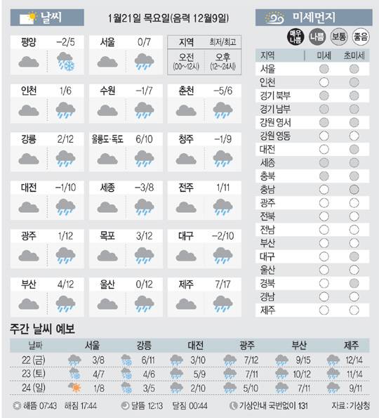 <날씨이야기>1월21일 목요일(음력 12월9일)