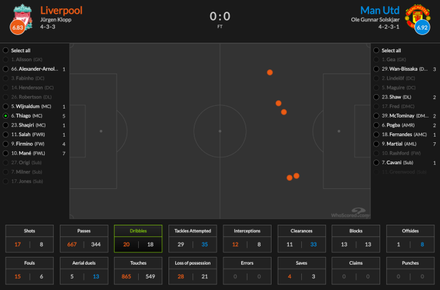 그런데 리버풀 골키퍼 알리송의 놀라운 선방과 맨유 수비진의 집중력이 서로 득점을 허락하지 않았다. 골대로부터 20야드 즉, 상대방 박스 근처부터 골대까지의 지역에서 패스를 성공시킨 횟수(DEEP)는 리버풀이 17회, 맨유가 5회였다.