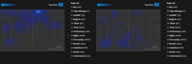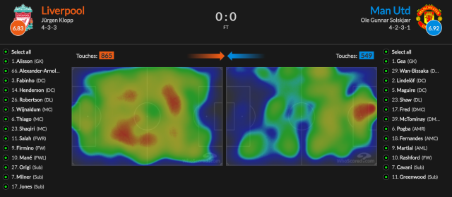 골고루 분포된 리버풀의 히트맵과 달리 맨유는 오른쪽에 비해 왼쪽에서 깊숙한 지역까지 전진했다는 바를 알 수 있다. 이날 패스 능력이 좋은 폴 포그바는 오른쪽에 위치했다. 올레 군나르 솔샤르 맨유 감독은 역습 시 포그바의 패스와 마커스 래쉬포드의 침투 능력을 활용해 리버풀 트렌트 알렉산더-아놀드와 조던 헨더슨의 뒷공간을 공략하려고 했다.