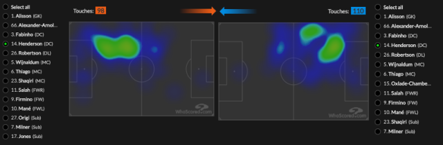 각각 vs 맨유, vs 사우스햄튼 헨더슨의 히트맵이다. 헨더슨의 수비적인 부담을 덜어주기 위해 클롭 감독은 헨더슨과 파비뉴의 자리를 바꿨다.