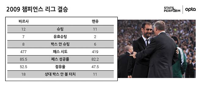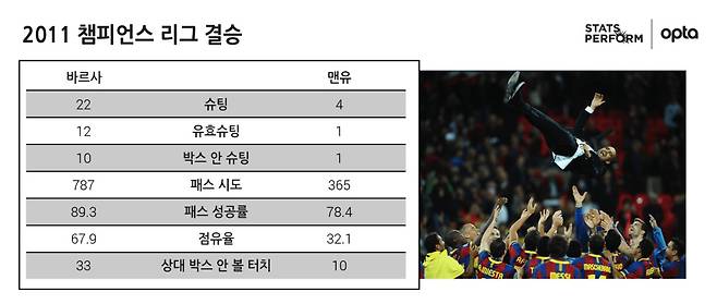 맨유 팀 전체가 286회의 패스만을 연결한 반면에 바르사는 차비, 이니에스타, 메시 세 선수만 합해도 340회의 패스를 연결했다. 이렇게 완벽한 결승전을 만들어낸 과르디올라가 이 경기 이후 10년이나 챔스 우승은 고사하고 결승에도 오르지 못했다는 사실은 믿기 어려울 정도다.