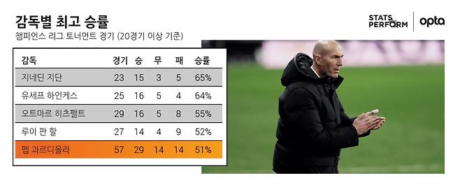챔피언스 리그(이하 챔스) 성적은 과르디올라의 오랜 비판 거리였다. 그러나 사실 챔스 역사상 최고 승률(62%) 기록을 보유한 감독이 바로 과르디올라다. 문제는 챔스에서는 모든 경기의 중요도가 똑같지 않다는 데에 있다. 조별 라운드에서 샤흐타르 도네츠크를 백 번 꺾는 것과 8강에서 한 번 패해 탈락하는 것의 무게는 전혀 다르다.