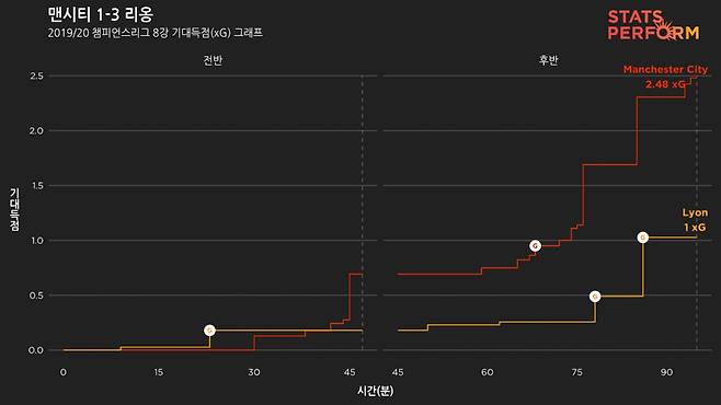 물론 과르디올라에게도 변명거리가 없었던 건 아니었다. 유난히 리옹전에 형편없는 슈팅들이 꽤 많이 나오면서 득점 기회를 충분히 살리지 못했다. 기대득점을 기준으로 분석하면, 이 경기에서 결정적인 득점 기회가 총 4번 나왔는데 이 중 3번이 맨시티의 슈팅이었다. 문제는 이 3번의 슈팅이 모두 유효슈팅조차 되지 못했다는 데에 있다.