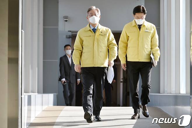 (수원=뉴스1) 경기사진공동취재단 = 이재명 경기도지사가 20일 오전 경기도 수원시 팔달구 경기도청에서 제2차 경기도 재난기본소득 지급 관련 기자회견을 위해 이동하고 있다. 2021.1.20/뉴스1