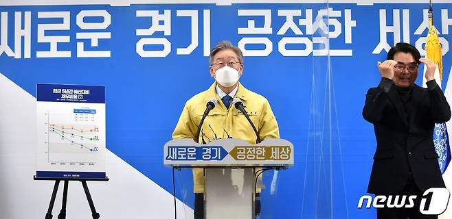 (수원=뉴스1) 경기사진공동취재단 = 이재명 경기도지사가 20일 오전 경기도 수원시 팔달구 경기도청에서 제2차 경기도 재난기본소득 지급 관련 기자회견을 하고 있다. 2021.1.20/뉴스1