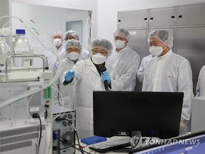 (안동=연합뉴스) 최재구 기자 = 문재인 대통령이 20일 오전 경북 안동시 SK바이오사이언스를 방문해 코로나19 백신 생산 시설을 시찰하며 이상균 공장장으로부터 품질검사에 대한 설명을 듣고 있다. 2021.1.20