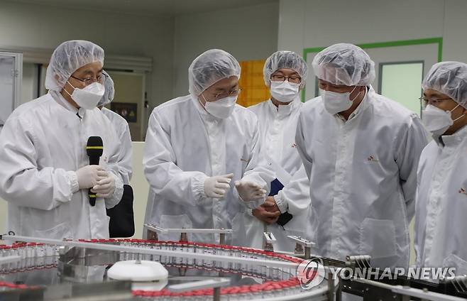 (안동=연합뉴스) 최재구 기자 = 문재인 대통령이 20일 오전 경북 안동시 SK바이오사이언스를 방문해 코로나19 백신 생산 시설을 시찰하며 최태원 SK 회장과 대화하고 있다. 2021.1.20