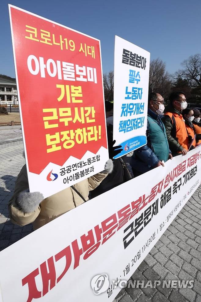 (서울=연합뉴스) 진연수 기자 = 민주일반연맹 공공연대노동조합 관계자들이 20일 서울 청와대 분수대 앞에서 재가방문돌봄노동자 한시지원금 지급방식 규탄 및 근본문제 해결 촉구 기자회견을 하고 있다. 2021.1.20