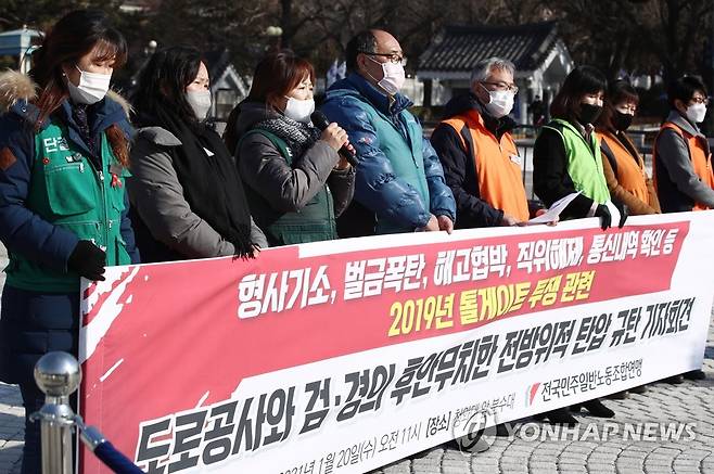 (서울=연합뉴스) 진연수 기자 = 민주연합노조 톨게이트지부, 공공연대노조 한국도로공사지회 등 전국민주일반노동조합연맹 조합원들이 20일 서울 청와대 분수대 앞에서 2019년 톨게이트 투쟁 관련 도로공사와 검찰·경찰의 보복성 탄압 규탄 기자회견을 하고 있다. 2021.1.20