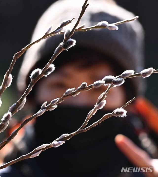 [수원=뉴시스] 김종택기자 = 절기상 대한(大寒)인 20일 경기도 수원시 광교산에서 등산객이 활짝 핀 버들개지를 바라보고 있다. 2021.01.20.