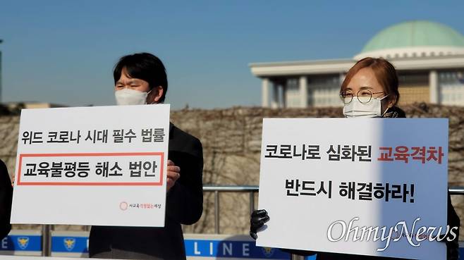 이날 기자회견 참석자들은 "코로나로 심화된 교육격차 반드시 해결하라!", "코로나 시대 필수 법률, 교육불평등 해소 법안"이란 글귀가 적힌 손팻말을 들고 있었다.