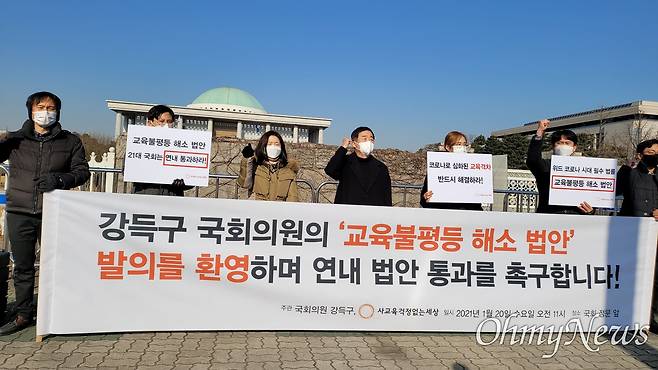 20일 오전 11시, 국회 교육위 강득구 의원과 '사교육걱정'은 서울 여의도 국회 앞에서 기자회견을 열고 "부모 경제력에 의해 기울어진 운동장을 회복하고 학력대물림을 막기 위해 올해 안에 교육불평등 해소법이 통과되어야 한다"라고 촉구했다.