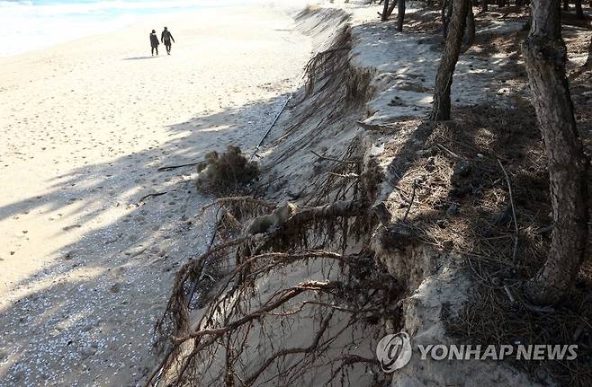 (강릉=연합뉴스) 이해용 기자 = 20일 강원 강릉시 송정해변의 해송들이 반복된 해안침식으로 뿌리를 드러내고 있다. 2021.1.20