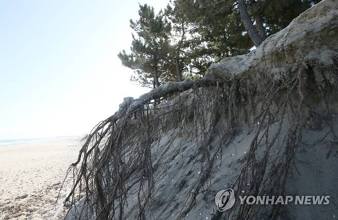 (강릉=연합뉴스) 이해용 기자 = 20일 강원 강릉시 송정해변의 해송들이 반복된 해안침식으로 뿌리를 드러내고 있다. 2021.1.20