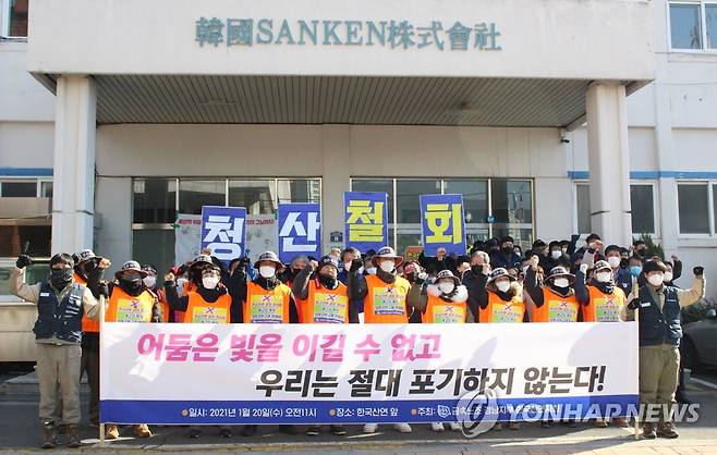 (창원=연합뉴스) 한지은 기자 = 외국인 투자기업인 한국산연의 폐업일인 20일 경남 창원 마산자유무역지역 한국산연 앞에서 노동자들이 구호를 외치고 있다. 2021.1.20