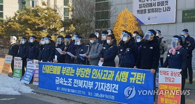 (익산=연합뉴스) = 민주노총 전북익산지역금속지회는 20일 오전 고용노동부 익산지청 앞에서 산업재해 신청을 방해하는 사측을 규탄하는 기자회견을 열고 있다. 2021.1.20 [민주노총 전북익산지역금속지회 제공. 재판매 및 DB 금지]