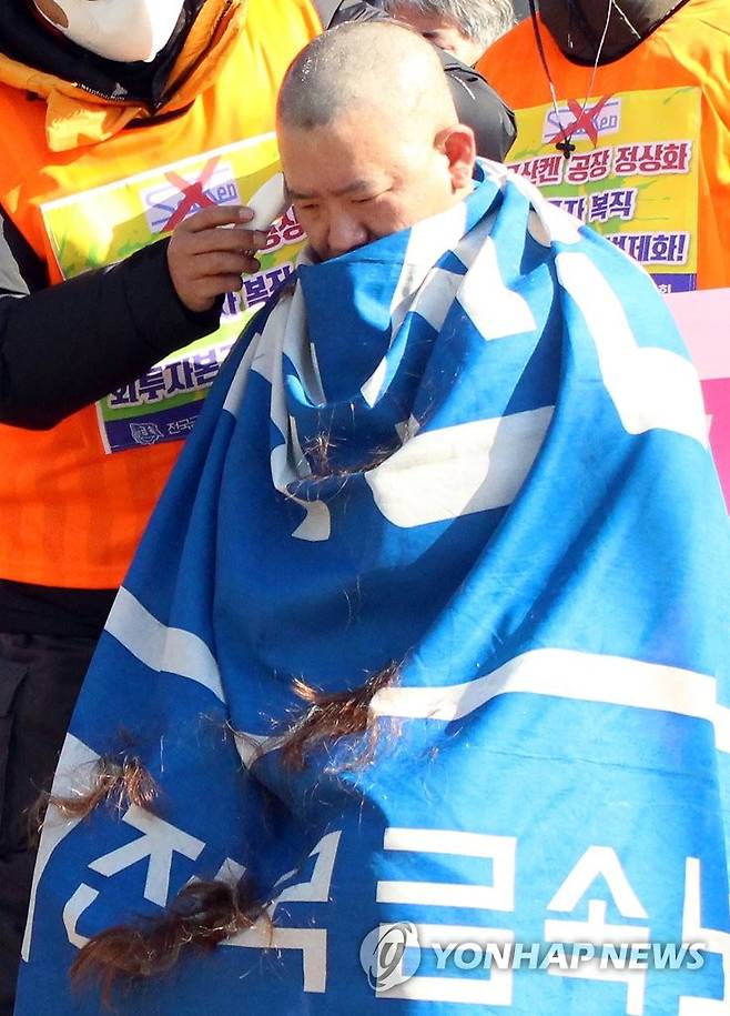 (창원=연합뉴스) 한지은 기자 = 외국인 투자기업인 한국산연의 폐업일인 20일 경남 창원 마산자유무역지역 한국산연 앞에서 노동조합 간부가 폐업 반대 삭발식을 하고 있다. 2021.1.20
