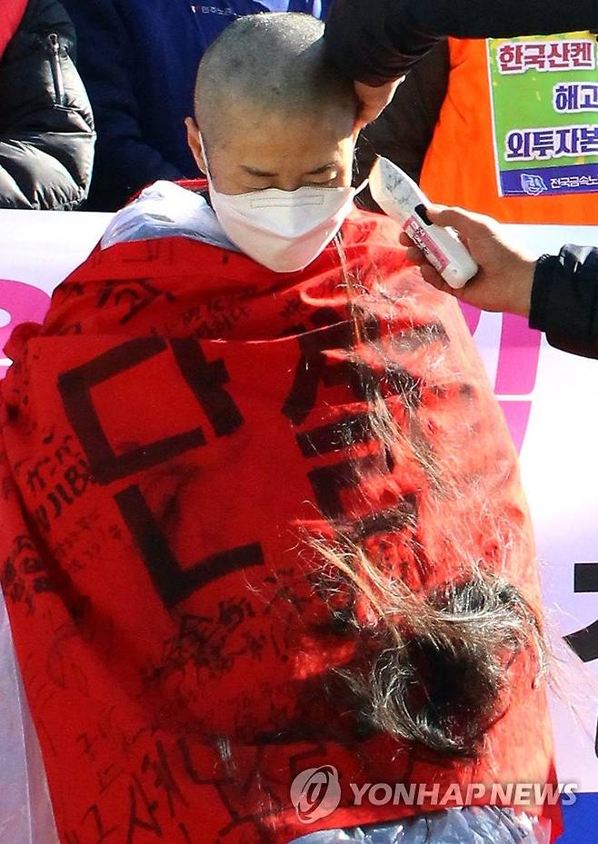 (창원=연합뉴스) 한지은 기자 = 외국인 투자기업인 한국산연의 폐업일인 20일 경남 창원 마산자유무역지역 한국산연 앞에서 노동조합 간부가 폐업 반대 삭발식을 하고 있다. 2021.1.20