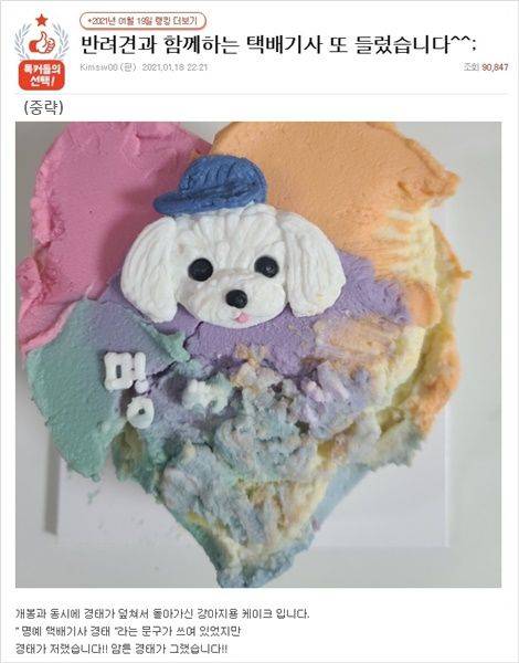 택배기사는 한쪽이 뭉개진 케이크 사진을 공개하며, "개봉과 동시에 경태가 덮쳐서 돌아가신 강아지용 케이크"라고 설명했습니다.