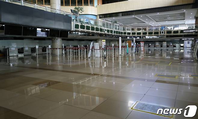 (김포공항=뉴스1) 정진욱 기자 = 국내 신종 코로나바이러스 감염증(코로나19) 확진자가 처음 발생한 지 1년째 되는 날인 20일 서울 강서구 김포공항 국제선 출국장이 한산하다. 2021.1.20/뉴스1