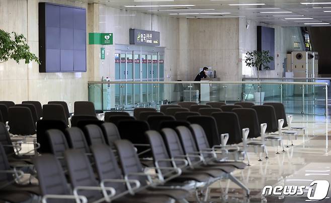 (김포공항=뉴스1) 정진욱 기자 = 국내 신종 코로나바이러스 감염증(코로나19) 확진자가 처음 발생한 지 1년째 되는 날인 20일 서울 강서구 김포공항 국제선 입국장이 한산하다. 2021.1.20/뉴스1
