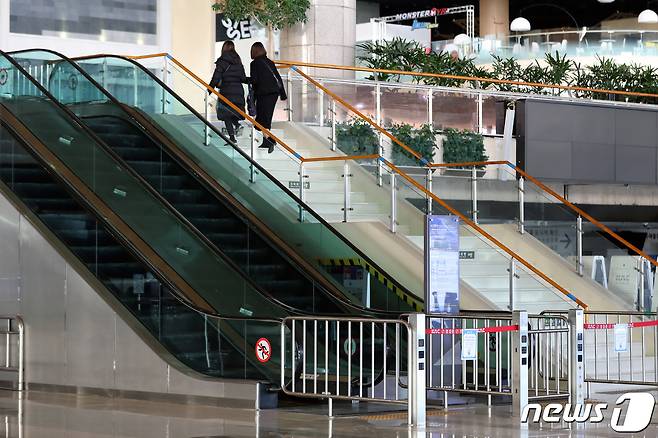 (김포공항=뉴스1) 정진욱 기자 = 국내 신종 코로나바이러스 감염증(코로나19) 확진자가 처음 발생한 지 1년째 되는 날인 20일 서울 강서구 김포공항 국제선 출국장이 한산하다. 2021.1.20/뉴스1