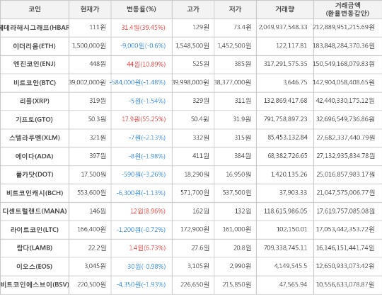 한편 거래금액 기준으로는 헤데라해시그래프, 이더리움, 엔진코인 순으로 가장 활발한 거래를 보이고 있다.