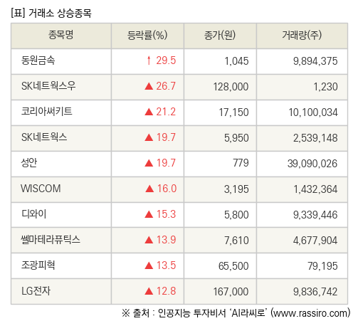 [fnRASSI]장마감, 거래소 상승 종목(동원금속 29.5% ↑)