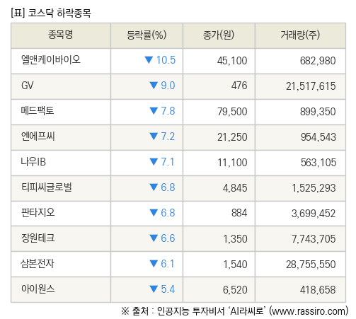 [fnRASSI]장마감, 코스닥 하락 종목(엘앤케이바이오 -10.5% ↓)