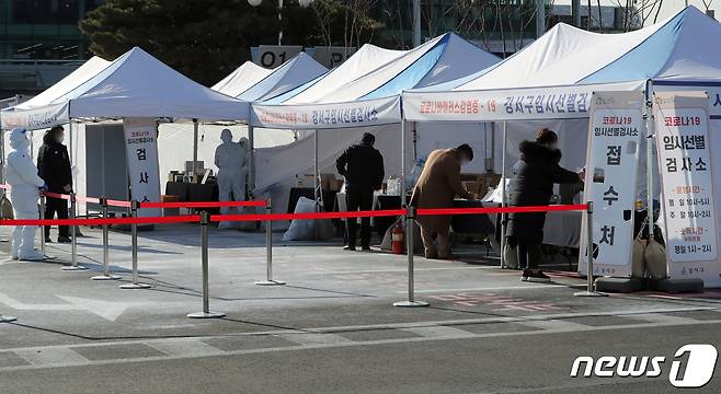 (김포공항=뉴스1) 정진욱 기자 = 국내 신종 코로나바이러스 감염증(코로나19) 확진자가 처음 발생한 지 1년째 되는 날인 20일 서울 강서구 김포공항 국내선 주차장에 마련된 임시선별진료소에서 시민들이 검체 검사를 받고 있다.2021.1.20/뉴스1