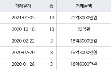 같은 기간 집계된 전용면적별 평균 실거래가격을 보면 △101㎡ 21억9000만원 △131㎡ 25억7000만원 등이다.