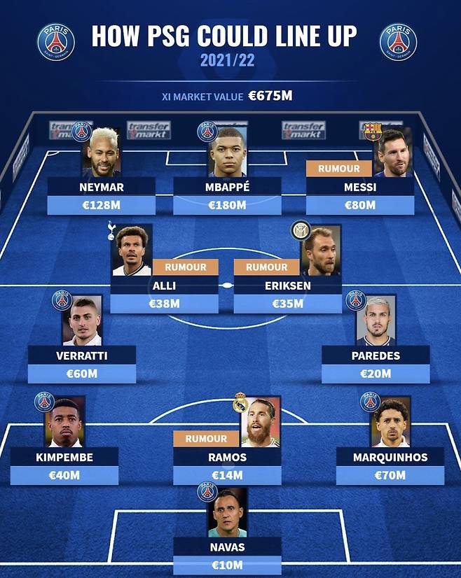 독일 축구 이적 전문사이트 트랜스퍼마르크트는 20일(한국 시간) '2021/22시즌 PSG가 꾸릴 수 있는 스쿼드'를 예상한 사진을 게시했다.