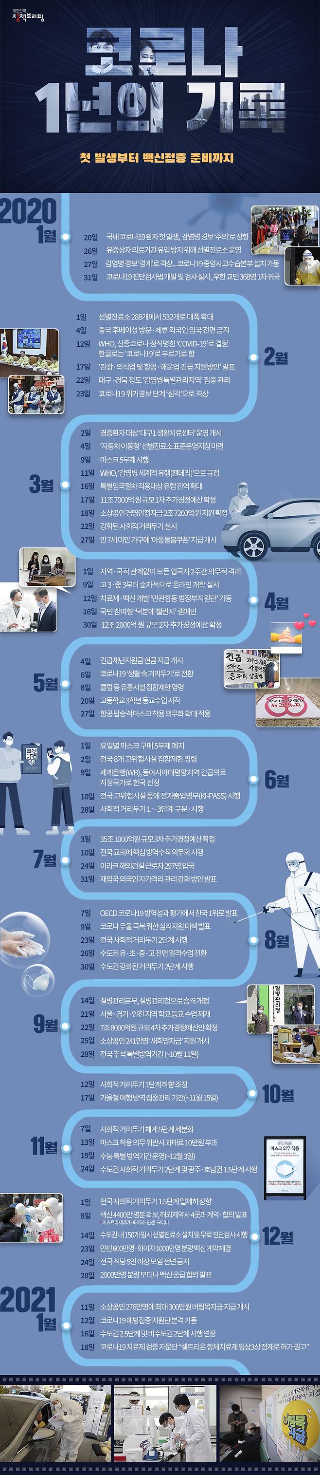 2021년 1월 20일은 코로나19가 국내에서 발생한지 꼭 1년이 되는 날이다. 하지만 여전히 코로나19와의 사투는 진행 중이다. 국내 코로나19 환자 첫 발생부터 백신접종 준비까지, 정책브리핑이 지난 1년의 기록을 짚어봤다.