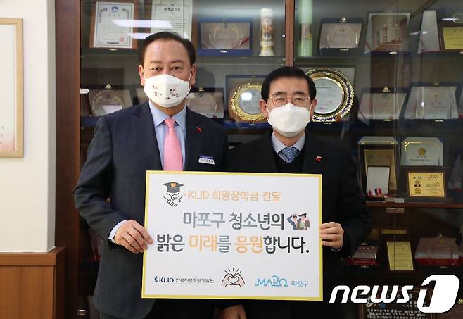 (서울=뉴스1) = 유동균 마포구청장(왼쪽)과 지대범 한국지역정보개발원장이 20일 오후 서울 마포구청에서 열린 장학금 전달식에서 기념촬영을 하고 있다. 한국지역정보개발원은 이날 중,고등학생 10명에게 지원할 920만원의 장학금을 마포구에 전달했다. (마포구청 제공) 2021.1.20/뉴스1