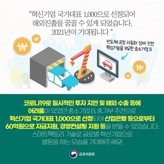 "혁신기업 국가대표 1,000으로 선정되어 해외진출을 꿈꿀 수 있게 되었습니다. 2021년이 기대됩니다." 코로나19로 일시적인 투자 지연 및 해외 수출 등에 어려움이있었던 중소기업 B. 중기부 추천으로 혁신기업 국가대표 1,000으로 선정되어 산업은행 등으로부터 60억원으로 자금지원, 경영컨설팅 지원 등을 받을 수 있었습니다.