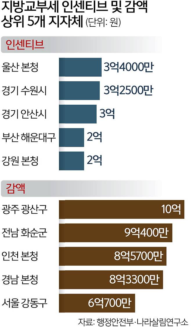 광역자치단체별로는 경기도가 지방교부세 차액(인센티브-감액)이 15억6000만원으로 가장 컸다. 도내 모든 시·군·구에서 감액은 없었고 인센티브만 발생했다. 이어 경북(5억1400만원), 울산(4억4000만원), 부산(3억7100만원), 충남(3억6500만원) 등의 순이었다. 반대로 감액-인센티브 차액이 가장 큰 광역단체는 11억400만원의 광주였다. 전남(-10억800만원)과 경남(-5억9300만원), 인천(-5억9100만원) 등의 차액 폭도 컸다.