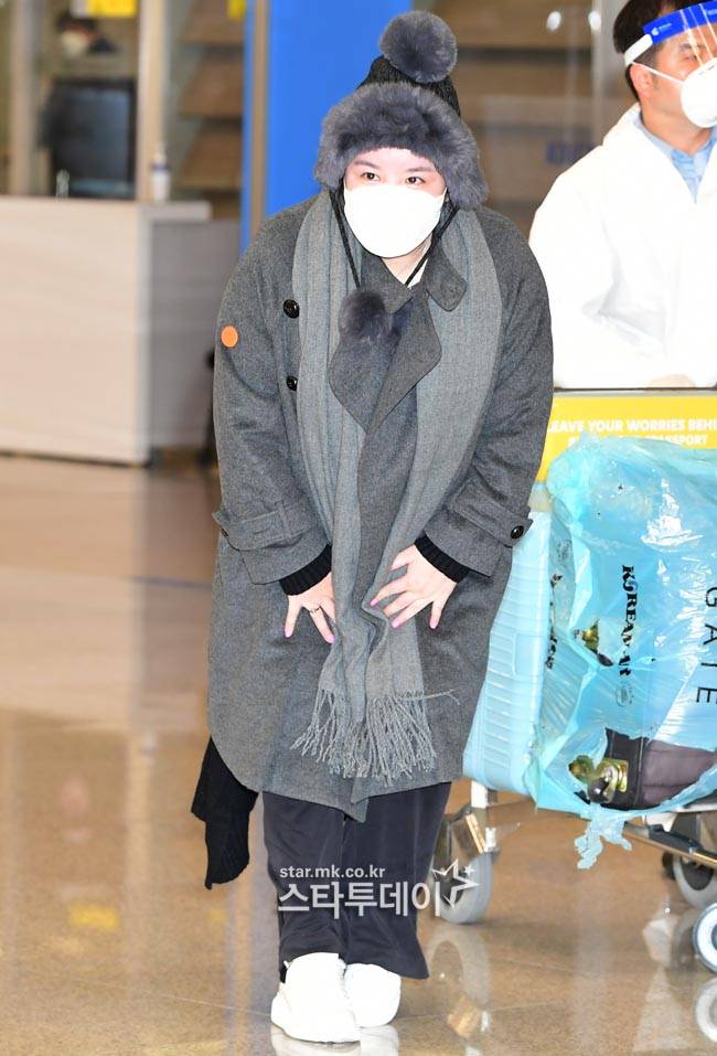 한국 땅을 밟은 에이미는 한 층 후덕해진 모습. 올 블랙 의상에 회색 목도리와 털 모자, 마스크를 낀 채 취재진 앞에 모습을 드러냈다.