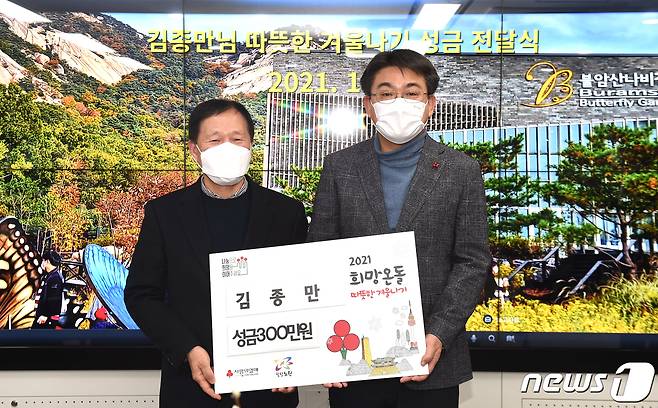 (서울=뉴스1) = 김종만 전 노원구서비스공단 이사장(왼쪽)이 20일 서울 노원구청에서 오승록 서울 노원구청장에게 '2021 희망온돌 따뜻한 겨울나기 성금' 300만원을 전달하고 있다. (노원구청 제공) 2021.1.20/뉴스1