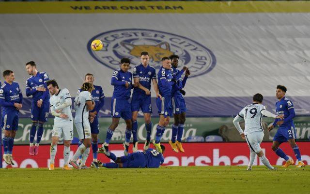 첼시의 메이슨 마운트(오른쪽 두 번째)가 19일(현지시간) 영국 레스터의 킹 파워 스타디움에서 열린 잉글랜드 프리미어리그 19라운드 레스터 시티와의 원정 경기에서 상대 수비벽을 넘기는 프리킥을 시도하고 있다. 이날 2대 0으로 승리하며 한 경기를 덜 치른 맨체스터 유나이티드를 제치고 선두로 도약한 레스터는 2015-2016 시즌에 이어 우승에 대한 기대감이 커지게 됐다. AP연합뉴스