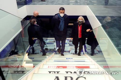 epa08951140 Spanish Prime Minister Pedro Sanchez (C) and president of Efe News Agency, Gabriela Canas (R), arrive to attend the Forum 'European Funds. The Clues for Recovery' organized by Spanish international news agency Efe and KPMG International at the headquarters of Efe News Agency in Madrid, Spain, 20 January 2021. EPA/JUANJO MARTIN / POOL