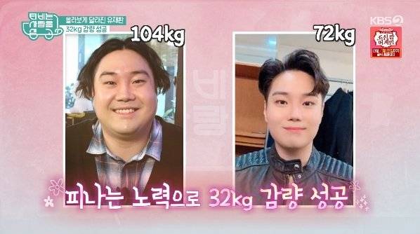 이에 유재환은 “살을 좀 뺐다. 건강이 너무 안 좋아졌다. 성인병, 고지혈증 같은 게 너무 심해서 비민으로 인한 질병이 너무 심해서 살을 빼기로 결심했다. 4개월 만에 32kg를 감량해 72kg이 됐다”고 말했다.