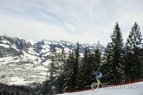 epa08951224 Matteo Marsaglia of Italy in action during a training run for the men's Downhill race of the FIS Alpine Skiing World Cup event in Kitzbuehel, Austria, 20 January 2021. EPA/CHRISTIAN BRUNA