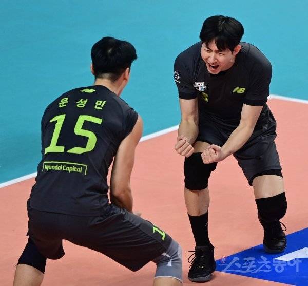 현대캐피탈 이시우가 서브에이스를 성공시킨 후 기뻐하고 있다.
