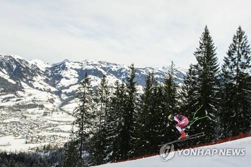 epa08951236 Daniel Danklmaier of Austria in action during a training run for the men's Downhill race of the FIS Alpine Skiing World Cup event in Kitzbuehel, Austria, 20 January 2021. EPA/CHRISTIAN BRUNA