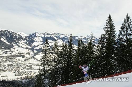 epa08951234 Nils Allegre of France in action during a training run for the men's Downhill race of the FIS Alpine Skiing World Cup event in Kitzbuehel, Austria, 20 January 2021. EPA/CHRISTIAN BRUNA