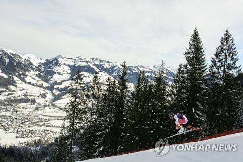 epa08951239 Gilles Roulin of Switzerland in action during a training run for the men's Downhill race of the FIS Alpine Skiing World Cup event in Kitzbuehel, Austria, 20 January 2021. EPA/CHRISTIAN BRUNA