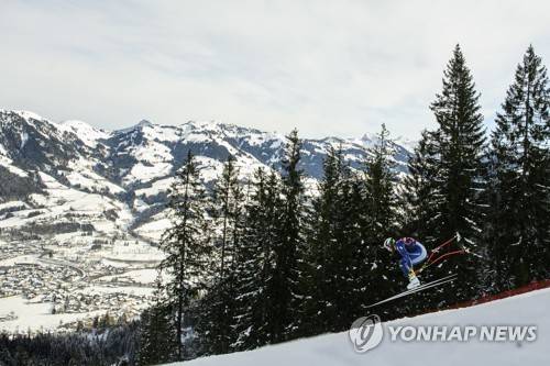 epa08951240 Emanuele Buzzi of Italy in action during a training run for the men's Downhill race of the FIS Alpine Skiing World Cup event in Kitzbuehel, Austria, 20 January 2021. EPA/CHRISTIAN BRUNA