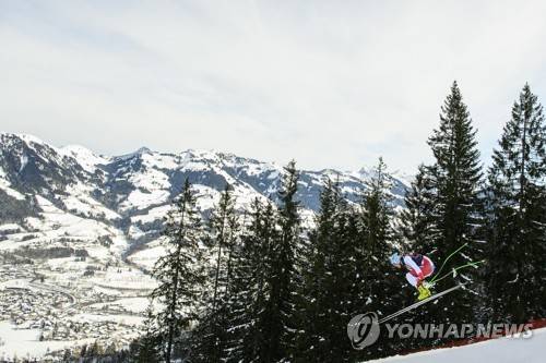epa08951243 Stefan Rogentin of Switzerland in action during a training run for the men's Downhill race of the FIS Alpine Skiing World Cup event in Kitzbuehel, Austria, 20 January 2021. EPA/CHRISTIAN BRUNA