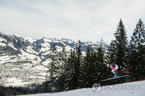 epa08951242 Manuel Schmid of Germany in action during a training run for the men's Downhill race of the FIS Alpine Skiing World Cup event in Kitzbuehel, Austria, 20 January 2021. EPA/CHRISTIAN BRUNA