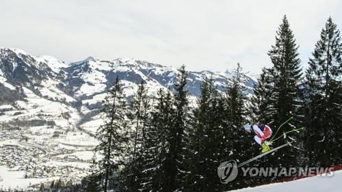 epa08951246 Stefan Rogentin of Switzerland in action during a training run for the men's Downhill race of the FIS Alpine Skiing World Cup event in Kitzbuehel, Austria, 20 January 2021. EPA/CHRISTIAN BRUNA